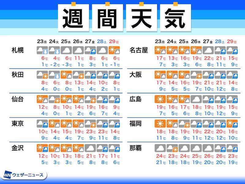 週前半はここ数日の気温の高い状況が一旦落ち着き、この時期らしい空気の冷たさが戻ってきます。週後半は再び暖かな空気が流れ込んで、春本番の暖かさとなるところが多くなる予想です。