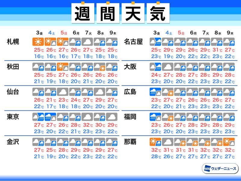 梅雨前線が本州付近に停滞して、西日本や東日本では断続的に強雨や大雨となるおそれがあります。 3日(金)~4日(土)は梅雨前線の活動が活発化し、西日本や東日本を中心に強雨や大雨に警戒が必要です。 5日(日)になると西日本から東日本では雨が止むところが多くなります。