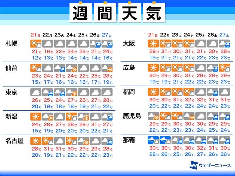 来週中頃にかけては、梅雨前線が南下して本州の南に停滞するため、西日本を中心に晴れる日が多く、梅雨の中休みとなりそうです。 関東や東北、北海道では、上空の寒気や湿った空気の影響で雲が広がる日もある見込みです。気温が低めの日もある予想ですので、寒暖差で体調を崩さないようお気をつけください。 また、来週後半は梅雨前線が日本海付近まで北上して湿った空気が流れ込む予想で、各地で曇りや雨の梅雨空が戻る見込みです。