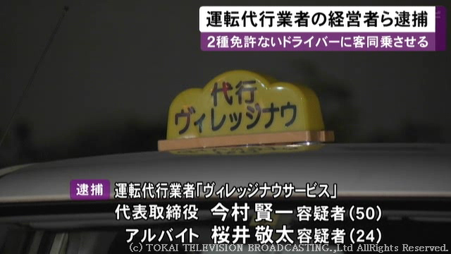 逮捕されたのは、愛知県小牧市の運転代行業者「ヴィレッジナウサービス」の代表取締役・今村賢一容疑者(50)とアルバイト従業員の櫻井敬太容疑者(24)です。