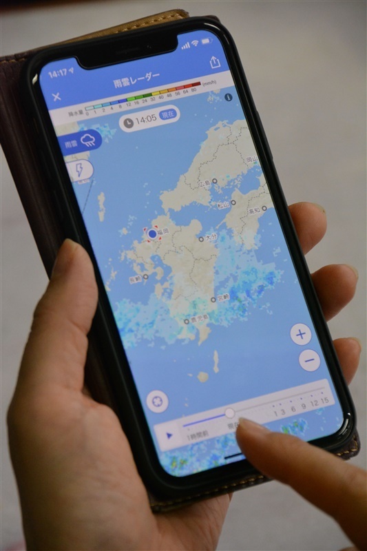 伊藤さんの自宅は福岡市早良区だが、今回の豪雨では防災情報の通知でスマホが鳴りっぱなしだった。さまざまな防災アプリが反応したり、地域の設定を細かくしておらず他地域の情報が送られてきたりしたようだ。「いろんなアプリを使うのではなく、一つを使い込む方が緊急時には役立つ。日頃からスマホで“避難訓練”しておくことも大切」と実感した。 日常的に「雨雲レーダー」も確認しておきたい。気象庁のサイトのほか、アプリ「Yahoo!天気」などでは15時間後まで雨雲の位置の予測が見られる。急な避難に備え、1~2日しのげるモバイルバッテリーを常に持っておくことも大事だ。 (酒匂純子、下崎千加)