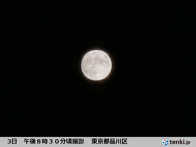 今夜(3日)午後8時30分頃に、東京都品川区から撮影した8月の満月「スタージャンムーン」です。午後10時現在も、都心の空を美しい夏の満月が照らしています。