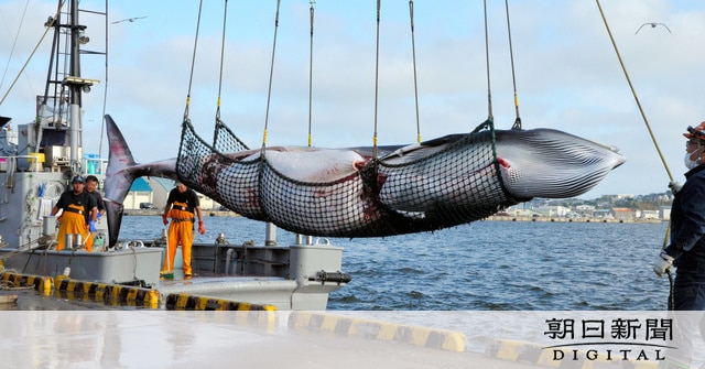 22日夕、釧路港に水揚げされたクジラは重さ5・6トン。日本小型捕鯨協会(福岡市)の貝良文会長は「ミンクとしては大きい方。脂ものって肉質がいい」と話した。競りを経て24日には釧路市や札幌市などの店頭で販売されるほか、料理店で提供される。釧路沖では10月までミンククジラ漁が続く。(武沢昌英)