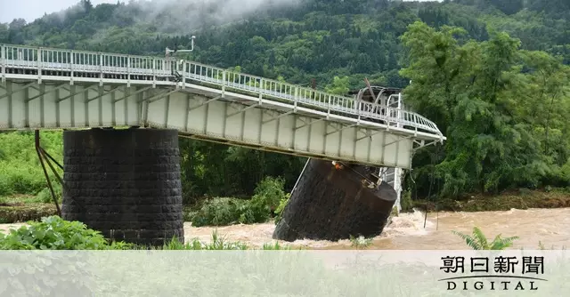 大雨特別警報の対象になった山形県飯豊町では、4日朝、小白川に架かるJR米坂線の鉄橋(長さ約40メートル)が崩落しているのが見つかった。分断された線路が川に垂れ下がった状態だという。同県米沢市では、市内を流れる川が増水して橋の橋脚が曲がり通行止めになった。福島県喜多方市でも、JR磐越西線の鉄橋が崩落した。