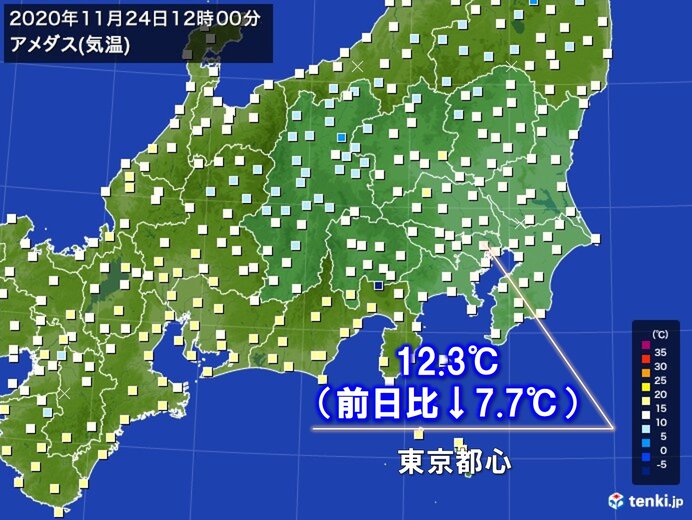 きょう24日、関東は沿岸部を中心に雲に覆われ、弱い雨の降っている所もあります。日中も気温は横ばいで経過しており、空気がヒンヤリしています。正午の気温は東京都心で12.3℃ときのうより8℃くらい低く、12月上旬並みとなっています。そのほか、正午の気温は横浜市で12.7℃、千葉市で12.6℃、水戸市で12.5℃などと、厚手の上着が欲しい寒さとなっています。 このあとも、気温はほとんど上がらず、空気は冷たいままでしょう。暖かくしてお過ごし下さい。
