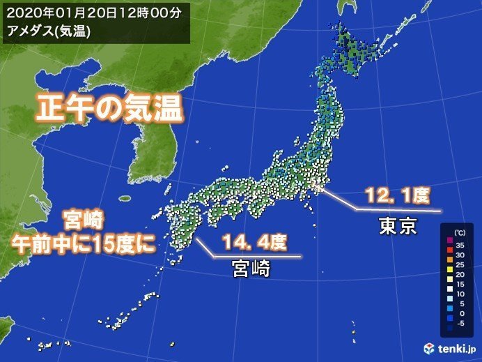 きょう20日(月)、正午の気温は、東京12.1度、名古屋11.2度、大阪11.0度、高知13.2度、宮崎14.4度など、晴れている地域で、10度を上回っている所が多くなっています。宮崎では昼前に15度まで上がりました。きょうは、二十四節気のひとつ「大寒(だいかん)」、暦の上では1年中で最も寒さが厳しい頃ですが、暦とは裏腹に、春先の気温になっている所があります。