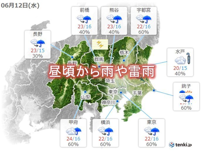 きょう12日(水)の関東地方は、天気の急変に要注意です。梅雨前線が南に後退しますが、曇り空が続く見込みです。また、この時期としては強い寒気を伴った気圧の谷が近づく影響で、次第に大気の状態が不安定になる見込みです。昼前後から夜にかけては、北部を中心に局地的な雨が降りやすくなり、雷を伴う所がありそうです。傘をさしていても濡れてしまうような雨になる所があるでしょう。