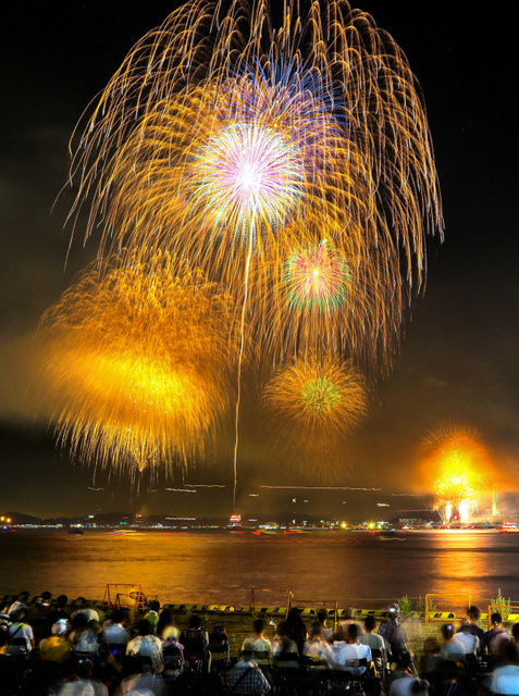 両市合同での開催は32回目。音楽にあわせて次々に打ち上げる「音楽花火」や海面付近で華やかにきらめく「水中花火」、全国の被災地の復興を願って不死鳥をイメージした「フェニックス」、1尺5寸の大玉などが夜空にあがり、両岸の観客から歓声が上がった。