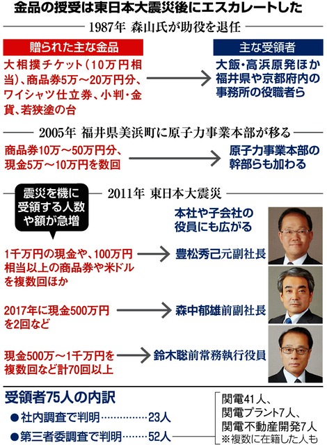 金品の提供は、遅くとも森山氏が助役を退任した直後の1987年には始まっていた。現金や金貨、高級ブランドの時計……。受領者の広がりは関電の原子力部門にとどまらず、送配電部門や子会社にも及び、約30年の総計で75人、約3億6千万円分にものぼった。