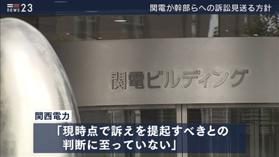 関西電力をめぐっては八木誠前会長や岩根茂樹社長など役員ら20人が、福井県高浜町の元助役から約3億2000万円相当の金品を受け取っていたことが分かっています。関西電力の株主5人は株価下落などで関西電力に損害が出たとして、八木前会長ら5人に約54億円を賠償させる訴訟を起こすよう関電に求めていました。関電は23日、「現時点で訴えを提起すべきとの判断に至っていない」との見解を示し、今後、第三者委員会の調査報告書を待って最終的に判断するとしています。