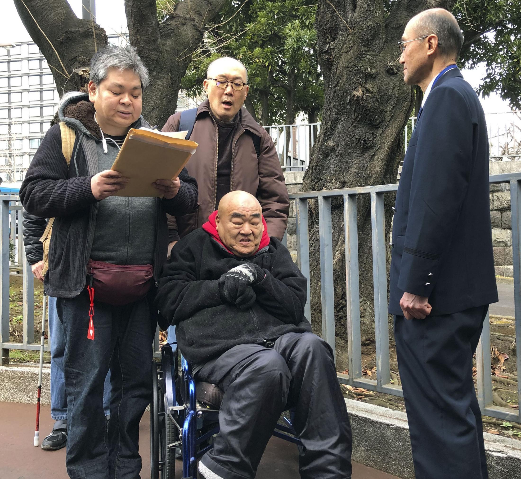 団体のメンバーらは7日午前、内閣府庁舎前で「障害者をだしに使うな」などと抗議した。