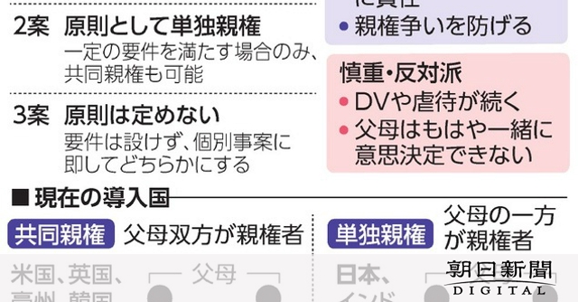 離婚後も父母双方が親権を持つ「共同親権」を導入するか、現行の「単独親権」を維持するかなどの論点について、法制審の家族法制部会は1年半かけて議論。共同親権の賛成派は「双方が子の養育に責任をもつべきだ」、反対派は「家庭内暴力や虐待が離婚後も続く」などと主張し、賛否が激しく対立した。
