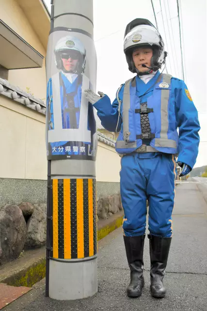 大分県警は、交差点や横断歩道を通過する車に徐行や一時停止を促すため、警察官をモデルにした実物大パネルを交差点や横断歩道付近に設置した。車のライトが当たると、反射ベストを着た上半身が浮かび上がる。それが目に入ることでドライバーの注意力も高まる、という効果を狙う。