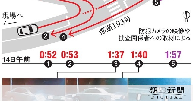 事件は14日午前2時前後に発生したとみられている。捜査関係者によると、防犯カメラの捜査などにより、通行した時間帯や場所から不審車を絞り込んだ結果、ミニバンと銀色のセダン車が浮上している。