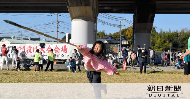 福岡県飯塚市鯰田の田んぼで26日、飛距離1メートルにつき新米100グラムがもらえる「やり投げ大会」が開かれた。111人が出場し、真剣な表情でやりを放った。