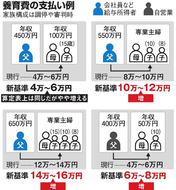 最高裁の司法研修所が23日、離婚訴訟などで使われる養育費の新しい算定基準を公表する。社会情勢の変化に合わせ、2003年に初めて作られた旧基準を16年ぶりに改定した。新基準に基づく受取額は、月1万~2万円増えるケースが多くなりそうだ。同日から全国の家庭裁判所で利用される。