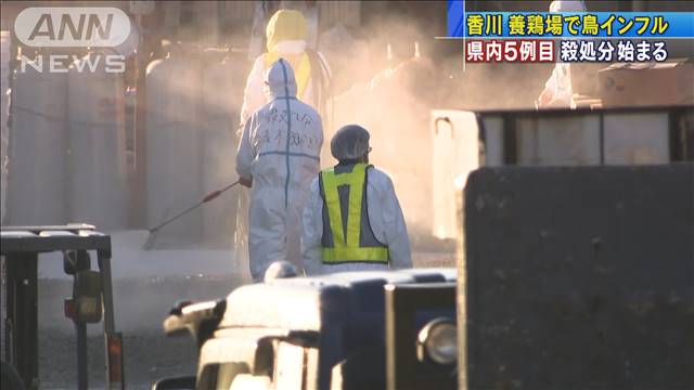 鳥インフルエンザの発生が相次いでいる香川県三豊市の養鶏場で、新たに県内5例目の発生が確認されました。 14日、三豊市の養鶏場から「死んでいるニワトリが多い」と連絡があり、遺伝子検査を行った結果、高病原性とみられる「H5亜型」の鳥インフルエンザウイルスが検出されました。この養鶏場は、卵を採るためにニワトリ約7万9000羽を飼育していて、県は15日午前5時から消毒と殺処分を行っています。鳥インフルエンザが確認された5つの養鶏場のうち、この養鶏場を含めた3つの養鶏場は同じグループ会社で、県では人や飼料の行き来について調べています。