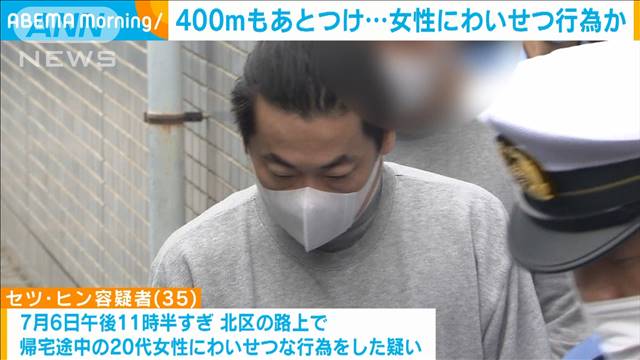 東京・北区の路上で20代の女性にわいせつな行為をしたとして、中華料理店従業員の35歳の男が逮捕されました。 中国人のセツ・ヒン容疑者は7月6日午後11時半すぎ、北区の路上で帰宅途中だった20代女性に背後から抱き付いて口をふさぎ、体を触るなどのわいせつな行為をした疑いが持たれています。警視庁によりますと、近くの防犯カメラには最寄り駅から約400メートルにわたって女性の後をつけて歩くセツ容疑者の姿が映っていたということです。取り調べに対し、セツ容疑者は「女性の肩に手を回しただけ」と容疑を否認しています。周辺では若い女性が同様の被害に遭う事件が起きていて、警視庁は余罪もあるとみて捜査しています。