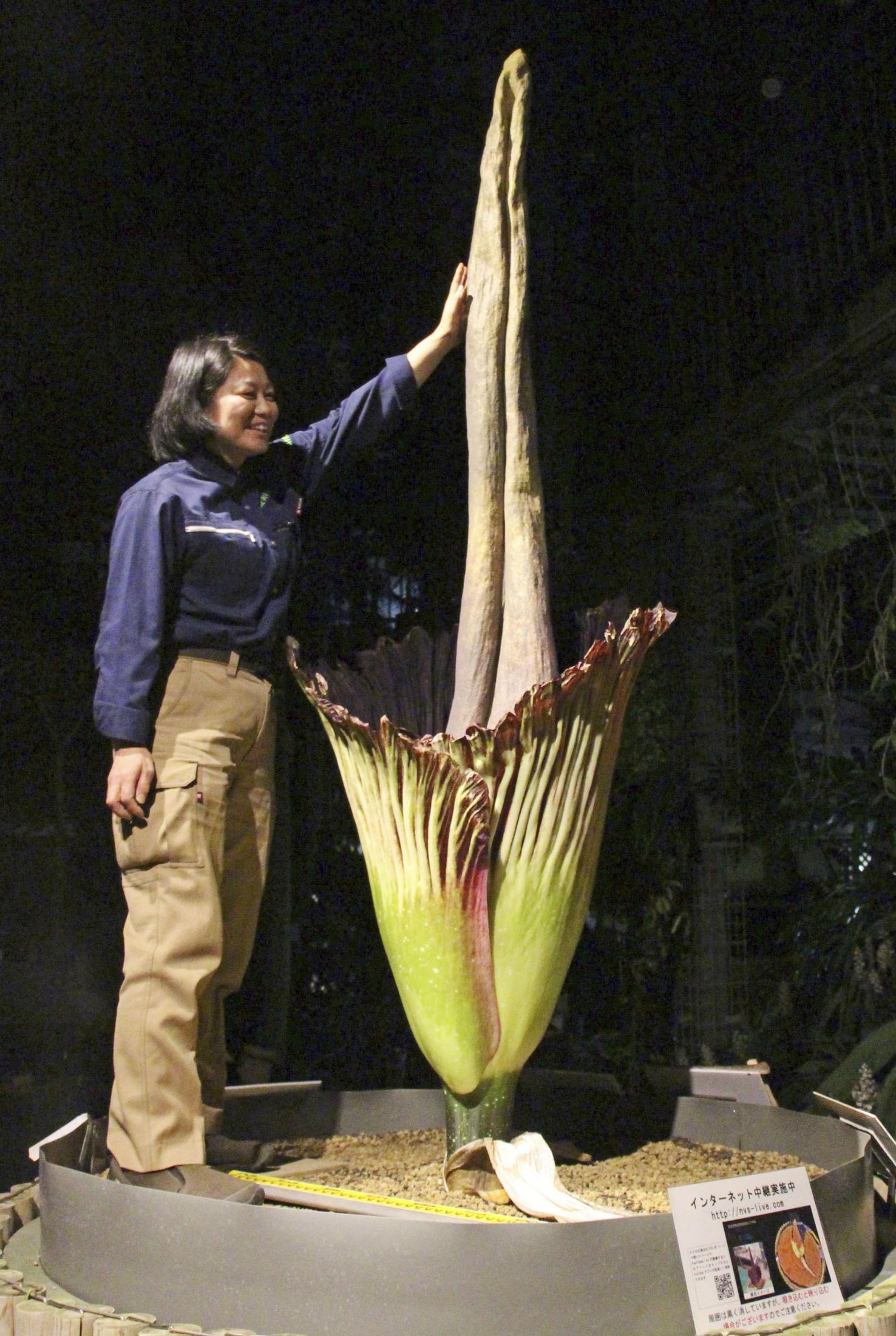 植物園によると、高さは約2.3メートル。この株が開花するのは5回目で、めったに咲かないとされるショクダイオオコンニャクの連続開花は世界的にも珍しいという。腐った肉のような臭いが特徴で、受粉のために虫を引きつける役割があるとされる。