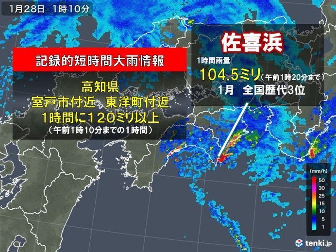 室戸市の佐喜浜では午前1時20分までの1時間に104.5ミリの雨を観測しました。これは、全国の1月の1時間降水量の歴代3位の記録です。