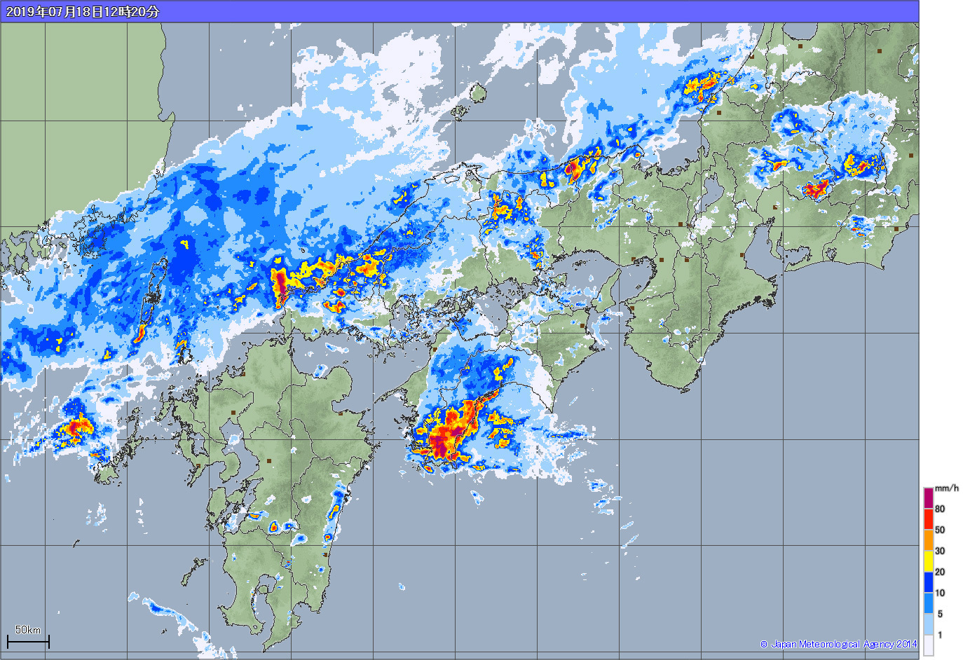 湿った空気が流れ込んで折る影響で、高知県は大気の状態が非常に不安定となり局地的に雨雲が発達している。高知県西部では、18日昼過ぎまで低い土地の浸水や河川の増水に警戒が必要だ。