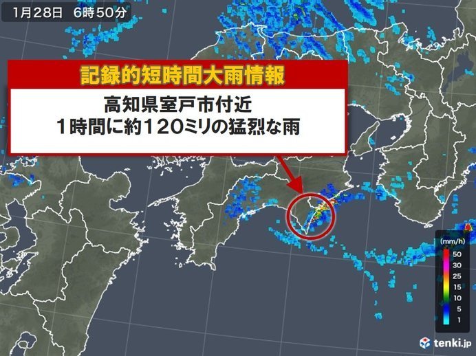 高知県室戸市付近では、きょう(28日)午前6時50分までの1時間に約120ミリの猛烈な雨が降ったとみられ、「記録的短時間大雨情報」が発表されました。室戸市付近では午前1時過ぎにも「記録的短時間大雨情報」が発表されており、きょう2回目です。