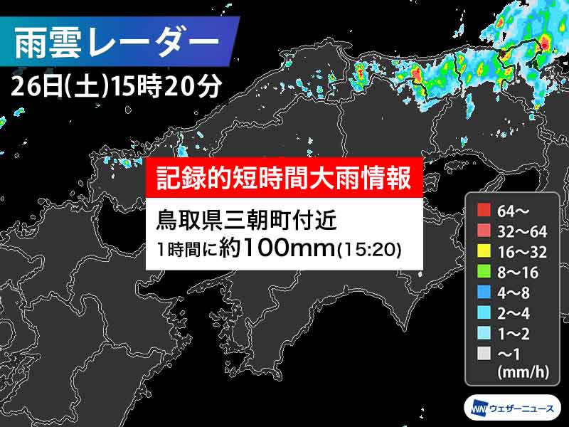 鳥取市鹿野付近で約90ミリ(解析雨量) 鳥取県鳥取市北部、鳥取市南部、三朝町には15時30分現在、土砂災害警戒情報が発表されています。崖の近くなど土砂災害の発生しやすい地区等にお住まいの方は、早めの避難を心掛けるとともに、市町村から発表される避難勧告などの情報に注意してください。