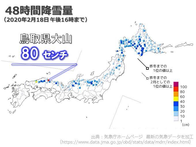 今回の大雪で、九州から北海道にかけて、この冬一番の降雪量となったところも多くなりました。鳥取砂丘では一面銀世界となり、同じ鳥取県の大山では、18日午後4時までの48時間に80センチの降雪量を観測しました。各地でどれくらいの雪が降ったのか見ていきましょう。