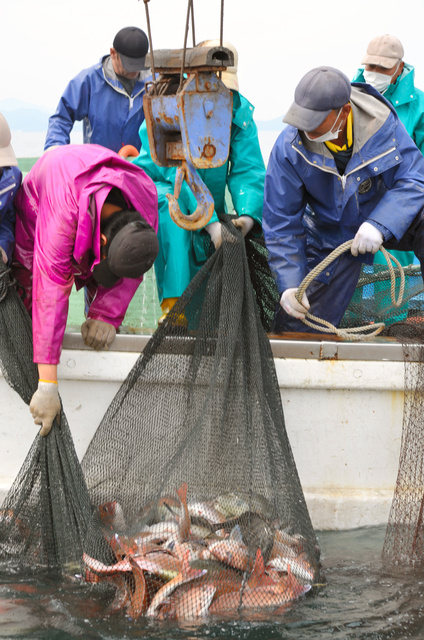 3日午前、粟田漁港を出た北灘漁協所属の漁船。沖合で船員が網を引き揚げると、淡いピンク色のタイが勢いよく跳ねた。この日の水揚げは約700キロ。大きいものは体長70センチ、重さ5キロに達した。東京の市場では最高1キロ3500円で取引されるという。漁は5月上旬まで続く。