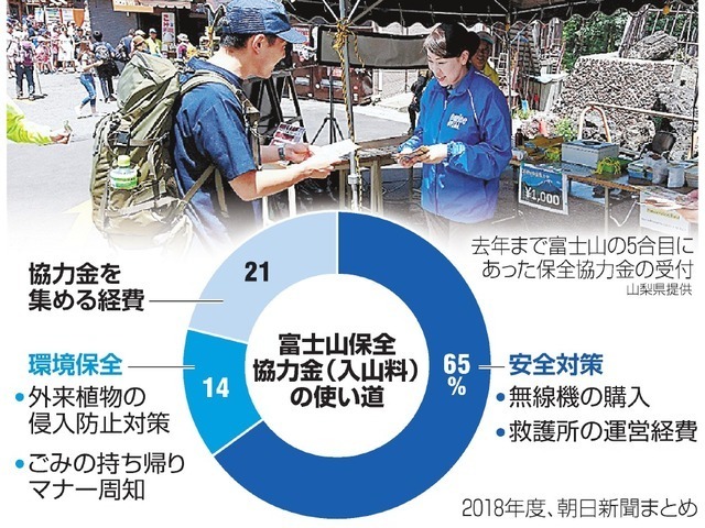 5年前に本格導入された入山料はこれまで、車で行くことができる5合目を中心に、登山をする人に限って係員が声をかけて集めてきた。昨年は約1億4千万円が集まり、山小屋のトイレの改修や救護所の運営などに使われた。…… 本文:1,325文字 この記事の続きをお読みいただくには、朝日新聞デジタルselect on Yahoo!ニュースの購入が必要です。