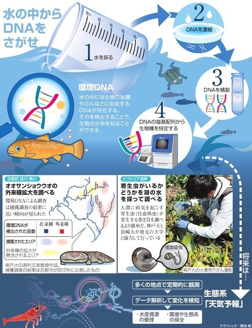 海や川などに漂うごくわずかな「環境DNA」から、そこにどんな生きものがいるかを調べられるようになってきた。野外作業は水をくむだけ。広域で定点観測すれば、生態系の中長期的な変化を天気のように予報できるかもしれない。