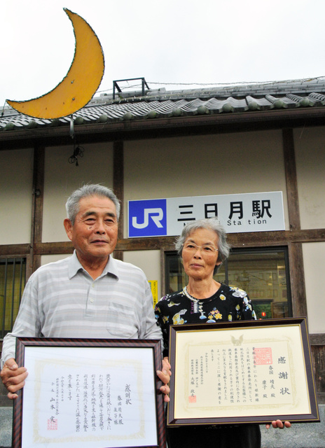 無人駅のJR姫新線三日月駅(兵庫県佐用町三日月)で32年余り休まずに乗車券の販売を続けてきた夫婦が9月末で役目を終え、3日、JR西日本などから感謝状を受け取った。同駅はJR西日本神戸支社管内で唯一、駅員以外に乗車券販売を委託していたが、これで廃止された。