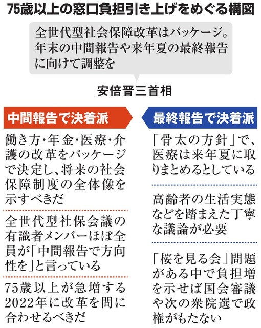 政府の全世代型社会保障検討会議が今月中旬に取りまとめる中間報告で、医療制度改革の具体案を示すかどうか、政府・与党でせめぎ合いが続いている。75歳以上の受診時の窓口負担を「原則1割」から「原則2割」に引き上げることなどに道筋をつけるべきだとの主張と、来年夏の最終報告まで慎重に検討するよう求める意見がぶつかる。