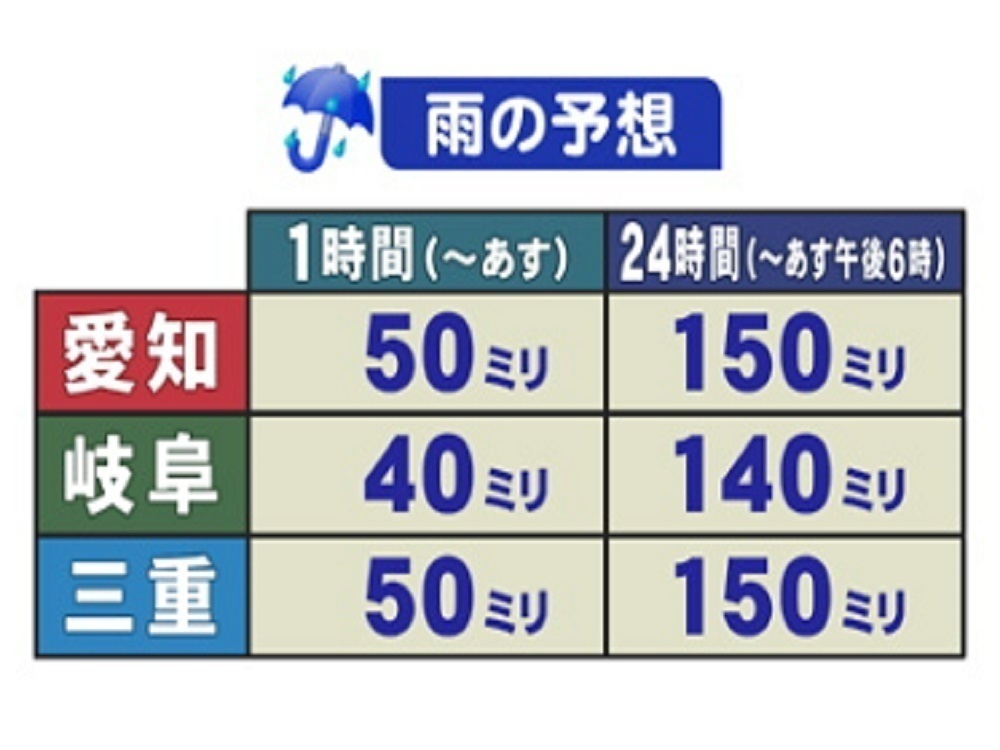また、4日午後6時までの24時間の雨量は、愛知県と三重県で150ミリ、岐阜県で140ミリと予想されています。