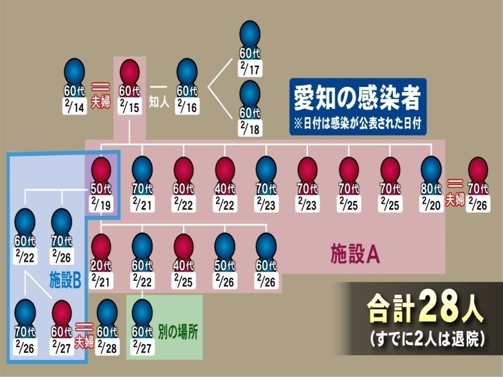 ・2月27日(木)名古屋市在住の60代男性と60代女性の2人 男性は22日に陽性が判明した名古屋高速の男性職員(60代)の同僚 女性は22日に陽性が判明した60代の男性とこれまでに3人が感染したとみられる市内の屋内施設で接触