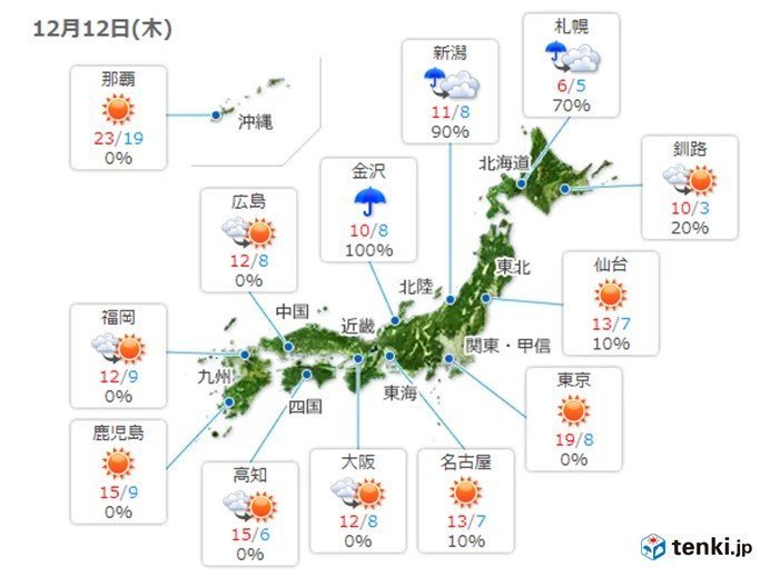きょう(12日)は次第に冬型の気圧配置に変わります。北海道や東北の日本海側は雨から雪に変わるでしょう。きのうより暖かくなる関東は、夕方以降ガクッと気温が下がりそうです。