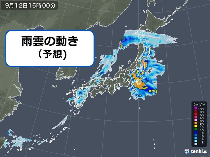 12日土曜も、九州~東北は、大気の状態が、非常に不安定でしょう。原因は、本州付近に停滞する「秋雨前線」と、南から本州に近づいてくる「熱帯低気圧」です。 このため、九州~東北では、局地的に雷を伴って、非常に激しい雨が降り、大雨となるおそれがあります。「非常に激しい雨」とは、滝のような雨で、傘は全く役に立たなくなり、車の運転は危険なレベルです。 特に雨が強まる地方は、九州や中国・四国と、東海や関東甲信・東北の太平洋側です。雨のピークは、秋雨前線がかかる九州や中国・四国では午前中、熱帯低気圧が近づく東海や関東甲信・東北の太平洋側では午後になりそうです。 13日午前6時までの24時間に予想される降水量は、いずれも多い所で、東北地方・伊豆諸島・東海地方・四国地方・九州南部で150ミリ、関東甲信地方で120ミリ、中国地方・九州北部地方で100ミリとなっています。土砂災害に厳重に警戒し、低い土地の浸水、河川の増水や氾濫に警戒が必要です。 また、近畿や北陸、東北の日本海側でも、雨や雷雨の所がありますので、お出かけの時に雨が降っていなくても、傘をお持ちになると安心です。竜巻などの激しい突風や落雷、降ひょうにも、十分お気を付けください。
