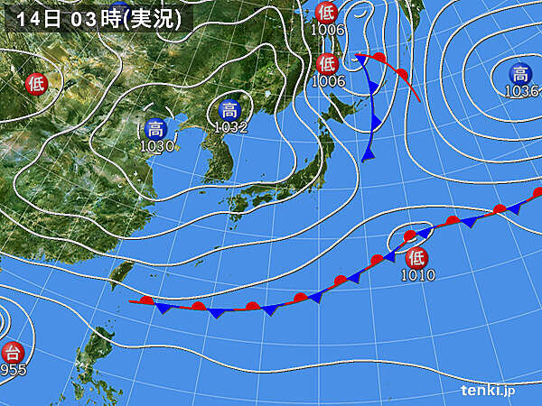 きのう13日の夕方から夜にかけて、北日本を寒冷前線が通過しました。きょう14日の朝、前線は離れつつありますが、寒気が流れ込んでいるため、北海道では雨や雪の降っている所があります。また、東北も日本海側ほど雲が多く、沿岸部を中心に冷たい北よりの風が強めに吹いています。