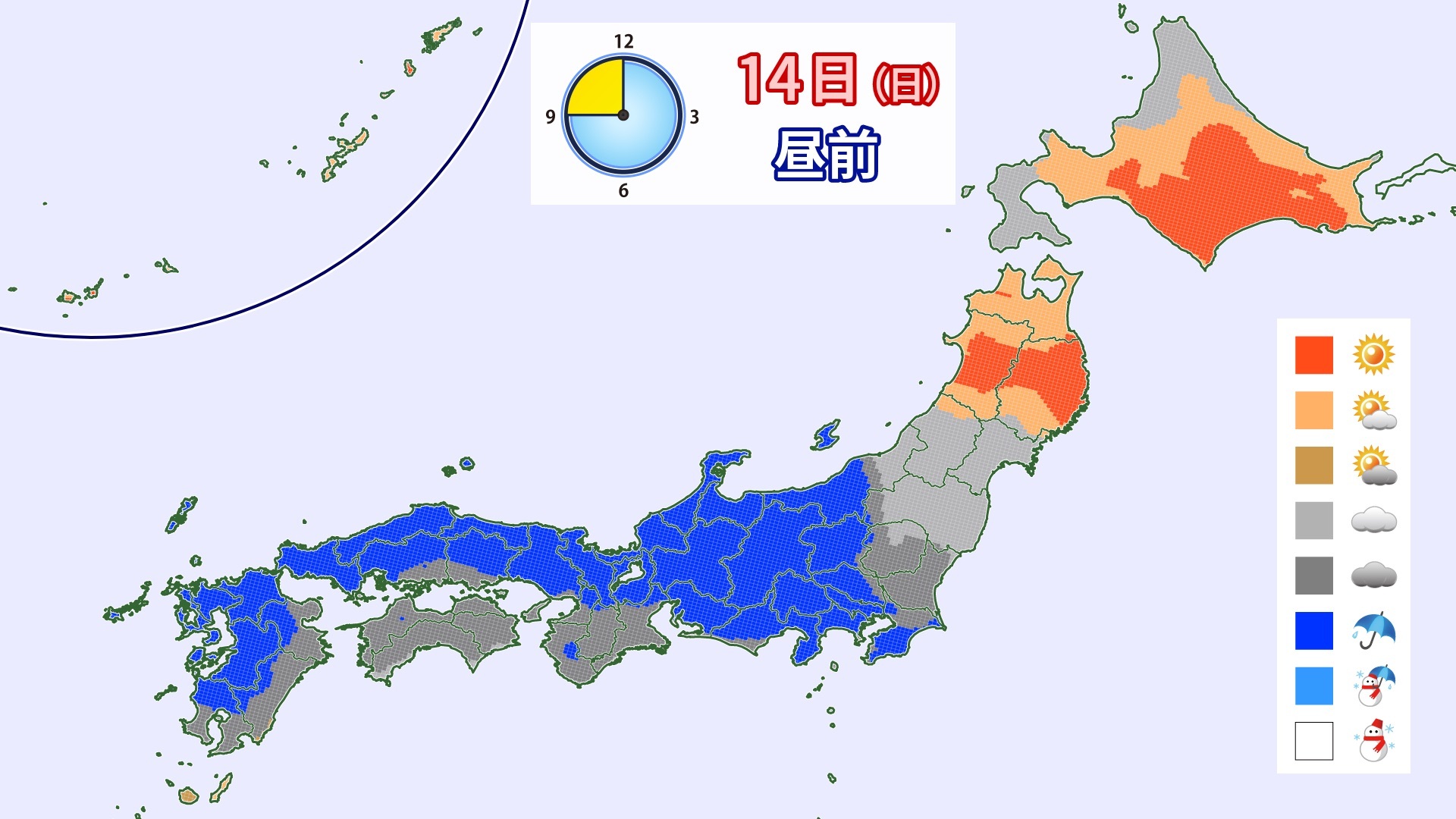 きょう(土)は梅雨前線の影響により、西・東日本の広い範囲で雨が降り、局地的に大雨となっている所がある。あす14日(日)も梅雨前線の影響を受け全国的に雨の降る所が多くなる見通しで、土砂災害や低い土地の浸水、河川の増水に注意・警戒が必要となりそうだ。