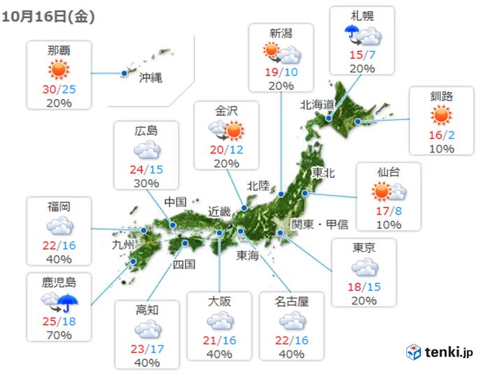 昨夜から気温がグッと下がり、今朝は北海道や本州の多くの所で今季これまでで最も冷えています。日中も気温はあまり上がらず、東海から西も25度に届かない所が多くなりそうです。