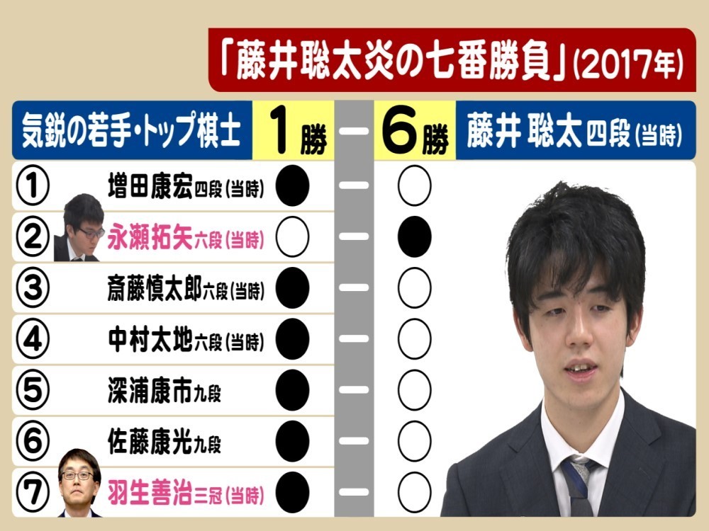 まだ連勝記録が話題になる前で、中学生棋士が当時の羽生三冠らトップ棋士の胸を借りるはずでしたが、蓋を開けてみれば当時四段だった藤井七段の6勝1敗で、将棋ファンにも驚きが広がりました。