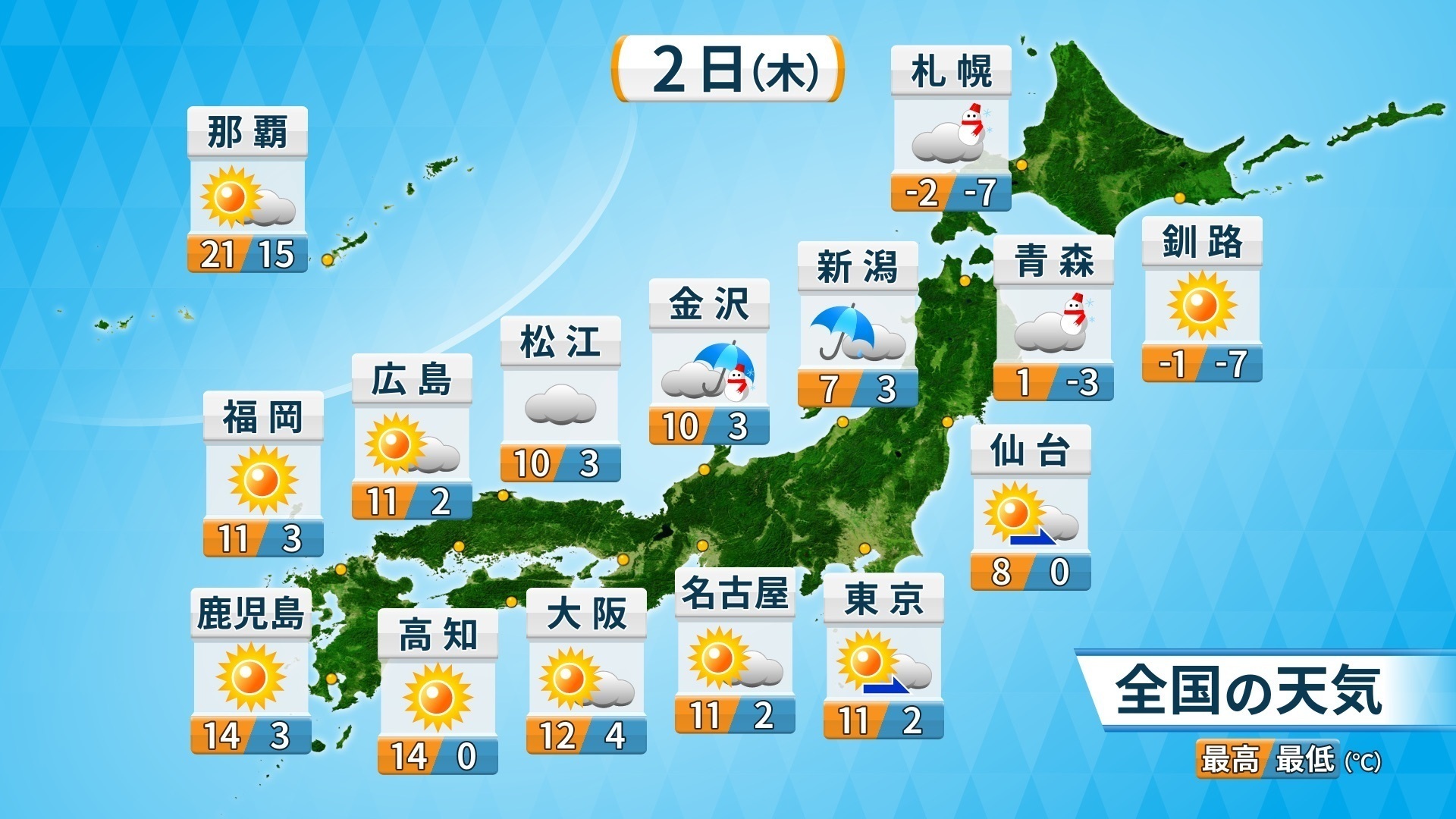 2日(木)は、西日本から東日本では太平洋側を中心に晴れて、お出かけ日和となる見込み。ただ、北日本は日本海側で雪の降る所が多く、特に北海道では猛ふぶきや吹きだまりによる交通障害に引き続き警戒が必要だ。