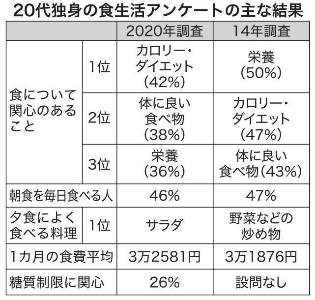 20代独身の食への関心が、栄養よりダイエットに移ってきたことが、農林中央金庫が実施した食の意識調査で分かった。食の関心事項を聞くアンケートによると、前回調査(2014年)で1位だった「栄養」は今回3位となり、代わりに「カロリー・ダイエット」が首位に。食についての関心そのものも全般的に下がる傾向がうかがえ、引き続き若い世代への食の情報発信が重要とした。