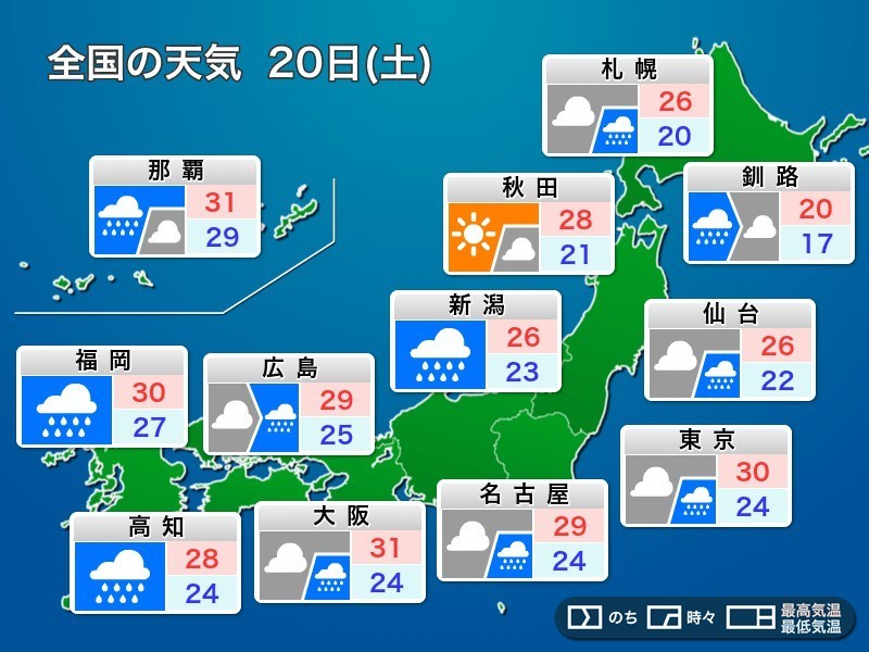 明日20日(土)は、西日本では台風外側の雲や湿った空気の影響で局地的に雨の強まる所がありそうです。