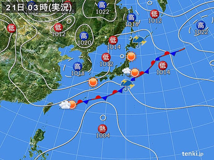 きょう21日敬老の日は、大陸から進んでくる高気圧に覆われますが、北海道は北部を中心に低気圧の影響を受けるでしょう。前線が、日本の東海上から伊豆諸島、沖縄、奄美付近に停滞するでしょう。