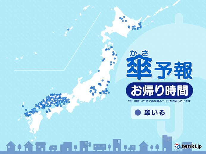 きょう(22日)の夜は、九州北部、中国・四国、近畿の一部では雨が降るでしょう。急に雨がざーっと降ったり、カミナリが鳴ったりする恐れがあるため、注意が必要です。また、関東甲信も所々で雨が降り、局地的に激しい雨が降るでしょう。東北と北海道も、所々で雨が降りそうです。