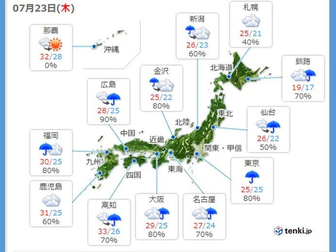 23日 4連休初日は梅雨空のスタート 九州は今夜前線上を低気圧が接近。北部を中心に非常に強い雨や大雨のおそれ。北海道も曇りや雨。沖縄は夏空。
