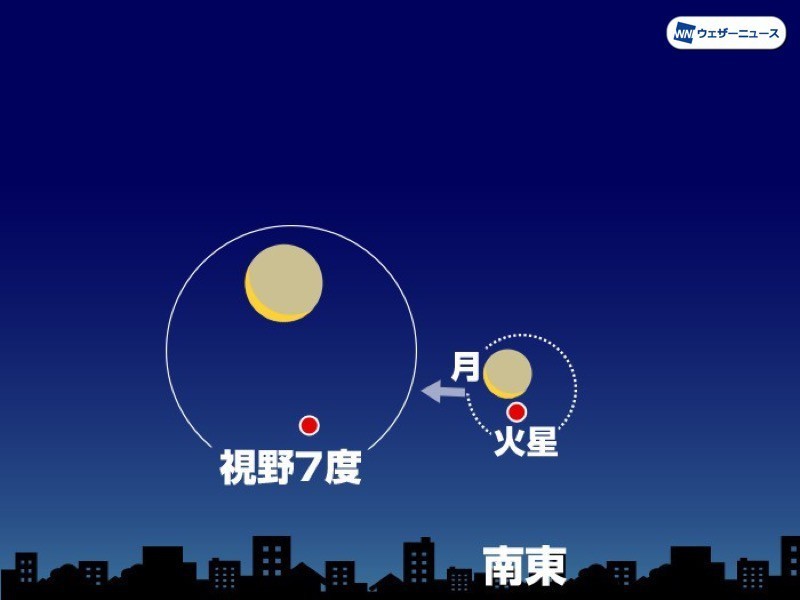 23日(月)の未明から明け方、東南東から南東の低空で月と火星が接近して見えます。