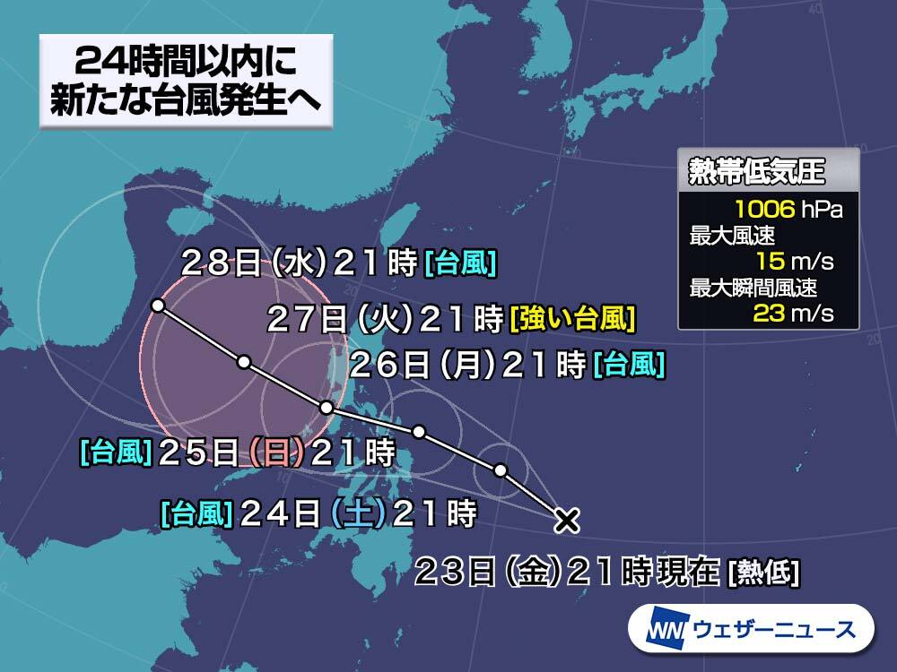 10月23日(金)21時現在、フィリピンの東で熱帯低気圧が発達中です。気象庁はこの熱帯低気圧について、24時間以内に台風に発達する見込みとの情報を発表しました。 次に台風が発生すると「台風18号」と呼ばれます。10月中に発生すれば今月5つ目の発生となり、10月としては7年ぶりの多さとなります。 ▼熱帯低気圧 10月23日(金)21時