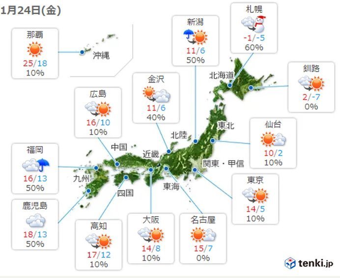 きょう24日、最高気温は3月並みの所がほとんど。きのう真冬本来の寒さだった関東と東海も、きょうの日中は15度前後まで上がる予想。
